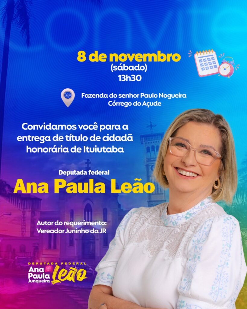 A deputada federal Ana Paula Leão será homenageada com o título de Cidadã Honorária de Ituiutaba no próximo sábado (8), às 13h30, em evento que será realizado na Fazenda do senhor Paulo Nogueira, no Córrego do Açude. A homenagem foi proposta pelo vereador Juninho da JR em reconhecimento à atuação da parlamentar e aos investimentos […]
