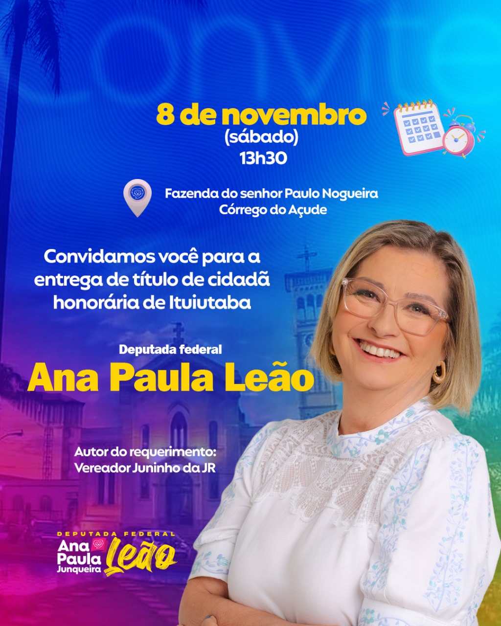A deputada federal Ana Paula Leão será homenageada com o título de Cidadã Honorária de Ituiutaba no próximo sábado (8), às 13h30, em evento que será realizado na Fazenda do senhor Paulo Nogueira, no Córrego do Açude. A homenagem foi proposta pelo vereador Juninho da JR em reconhecimento à atuação da parlamentar e aos investimentos destinados ao município nos últimos dois anos.